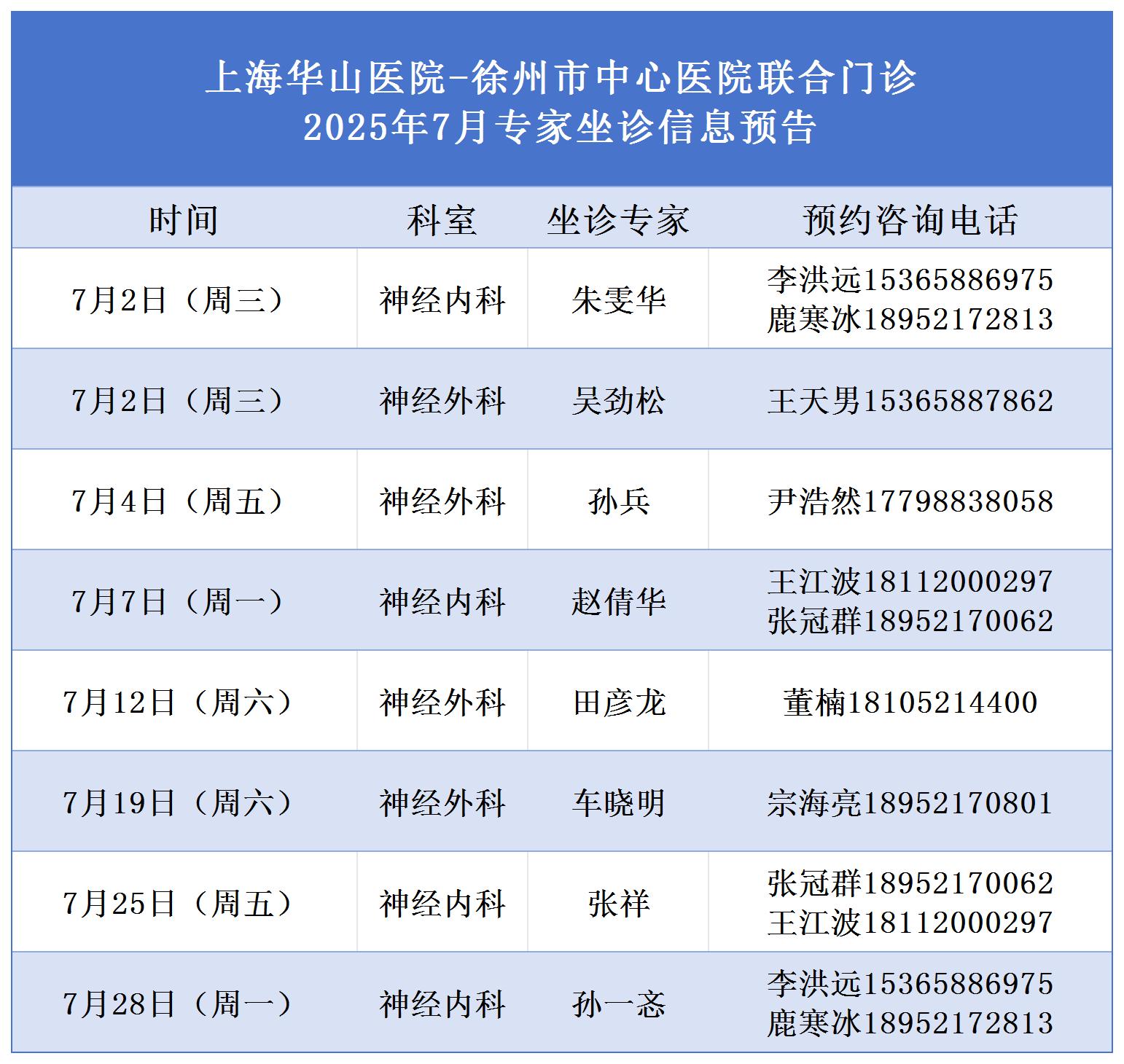 7月份,上海華山醫(yī)院神經(jīng)內(nèi)科專家朱雯華、趙倩華、張祥、孫一忞,神經(jīng)外科專家車曉明、吳勁松、田彥龍、孫兵將坐診我院“上海華山醫(yī)院-徐州市中心醫(yī)院聯(lián)合門診”,專家號源陸續(xù)發(fā)放,具體信息如下: