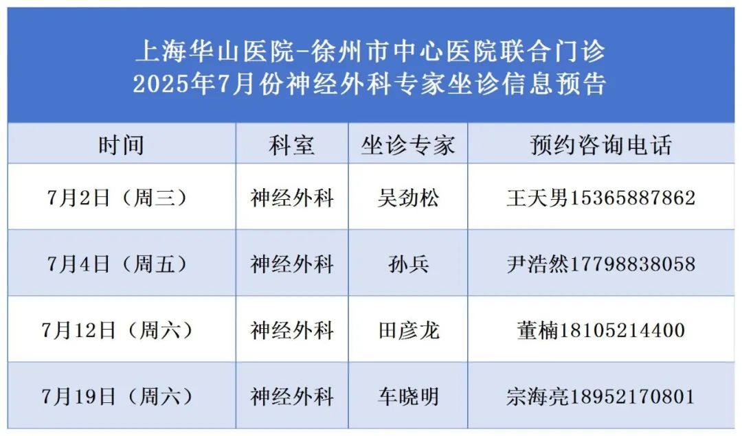 7月份,上海華山醫(yī)院神經(jīng)外科專家車曉明、吳勁松、田彥龍、孫兵將坐診我院“上海華山醫(yī)院-徐州市中心醫(yī)院聯(lián)合門診”,專家號(hào)源陸續(xù)發(fā)放,具體信息如下: